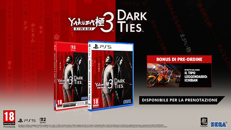 La rinascita di una leggenda e l'inizio di una nuova era. Yakuza Kiwami 3 è un remake totale del gioco d'azione e picchiaduro Yakuza 3 che segue la storia di Kazuma Kiryu, un ex-yakuza che cerca di proteggere coloro che ama. DARK TIES è un nuovo gioco che segue le vicende di Yoshitaka Mine, da Yakuza 3, in un'esperienza piena d'azione a sé stante. Preordina Yakuza Kiwami 3 e Dark Ties e ricevi il Tipo leggendario: Ichiban Kasuga, che aggiunge il prediletto dai fan, Ichiban Kasuga, alla Ryukyu Gal Gang.