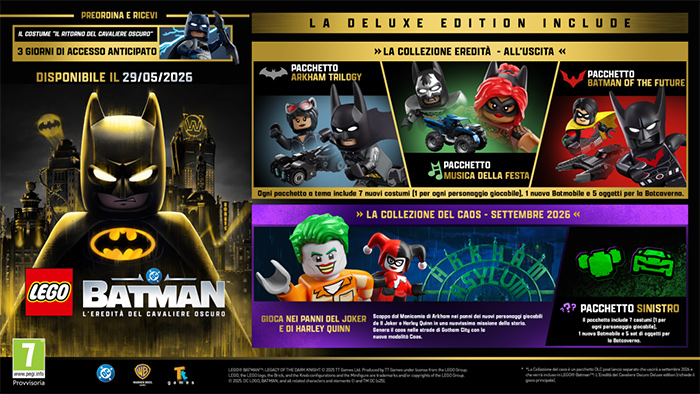 - Ogni pacchetto a tema include 7 nuovi costumi (1 per ogni personaggio giocabile), 1 nuova Batmobile e un set di 5 oggetti per personalizzare la Batcaverna